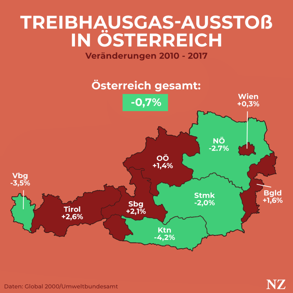 Aber in keinem anderen Bundesland sind die Treibhausgas-Emissionen in den letzten Jahren stärker gesunken als in Kärnten: Das Land konnte seinen Ausstoß zwischen 2010 und 2017 um 4,1% verringern. In fünf Bundesländern stiegen die Abgase im selben Zeitraum sogar an. Den stärksten CO2-Anstieg hat Tirol mit +2,6% mehr Abgas-Ausstoß.