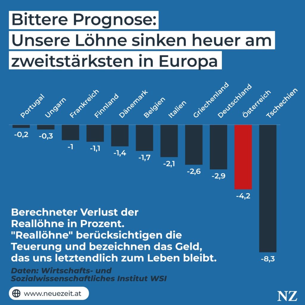 In Portugal verlieren die Beschäftigten überhaupt „nur“ 0,2%. Frankreich muss mit minus 1% rechnen, in Deutschland sollen die Reallöhne um 2,9% sinken.